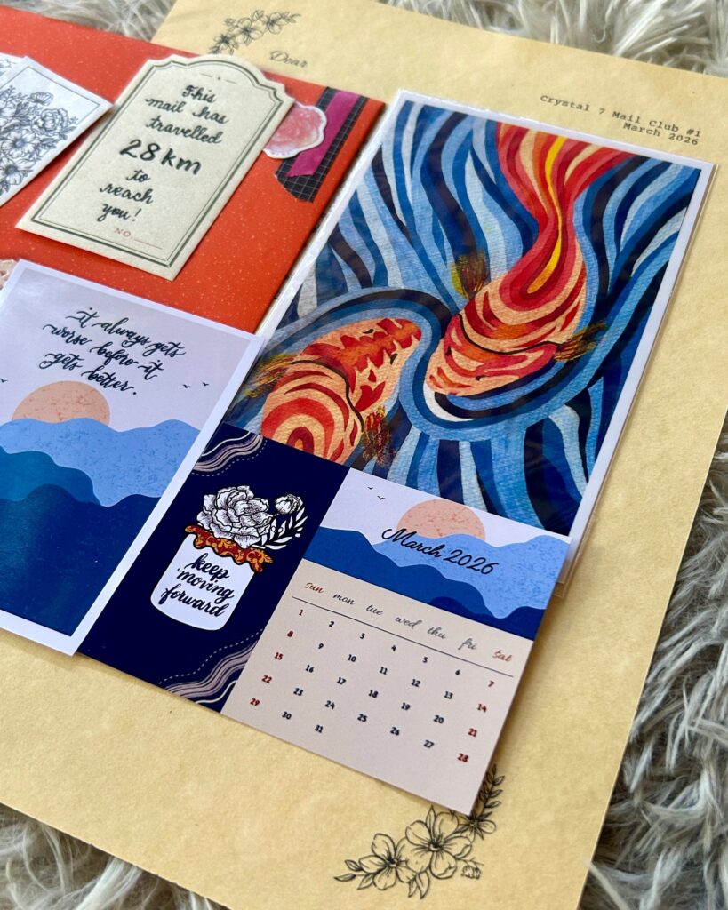This is exactly why I created the Crystal 7 Mail Club: a cozy monthly subscription that brings letters, art prints, stickers, and creative surprises directly to your mailbox. For the longest time, my art has lived quietly in my sketchbooks and papers, unseen. But now, I want to share it with you: to let you hold my creations in your hands, experience the stories behind them, and feel a little spark of calm and joy every month.
